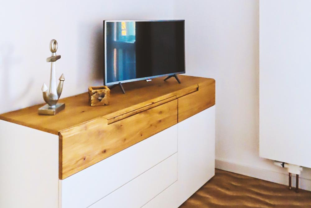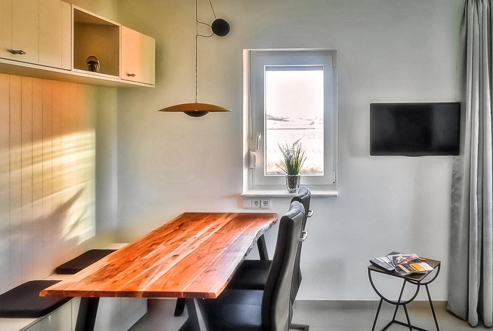 Die Ferienwohnung bietet in jedem Raum TV, eigenes schnelles Internet, Sofa mit Recamiere, Esstisch mit zwei Stühlen und einer Bank, hochwertiges modernes Doppelbett aus Eichenholz, Bad mit Regendusche, Handtuchheizkörper und Fön.